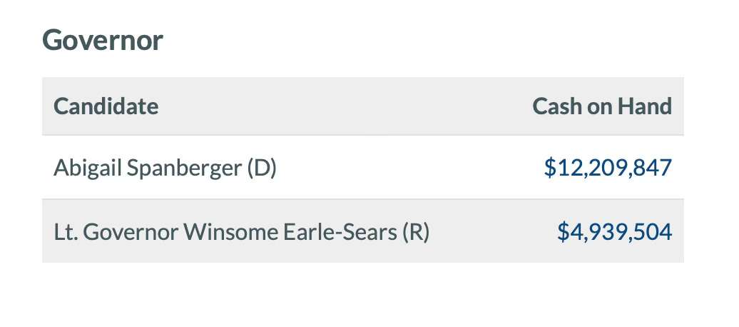 Spanberger also had a significant 3 to 1 Cash On Hand (COH) advantage as of the last report: