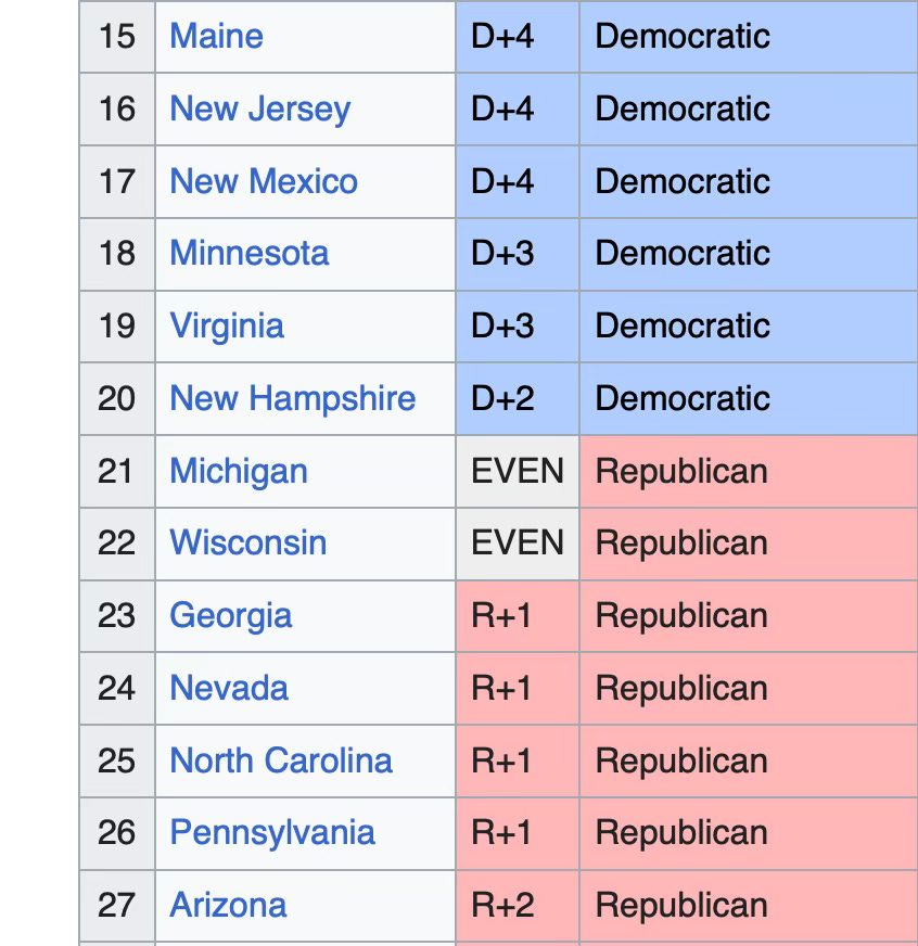 This is where Virginia is according to the Cook Partisan Voting Index. (PVI)