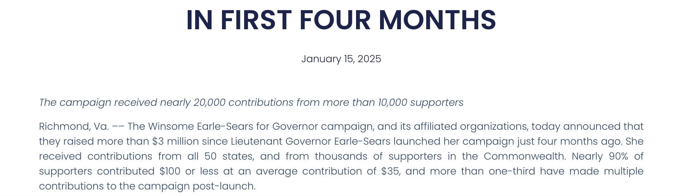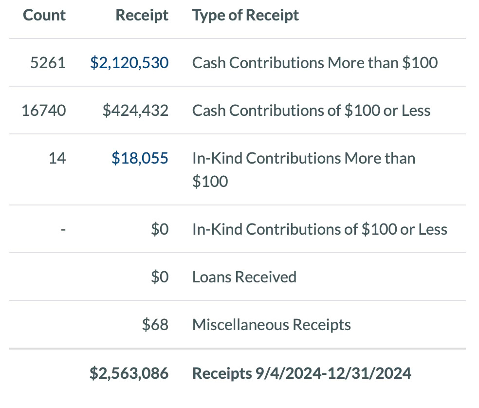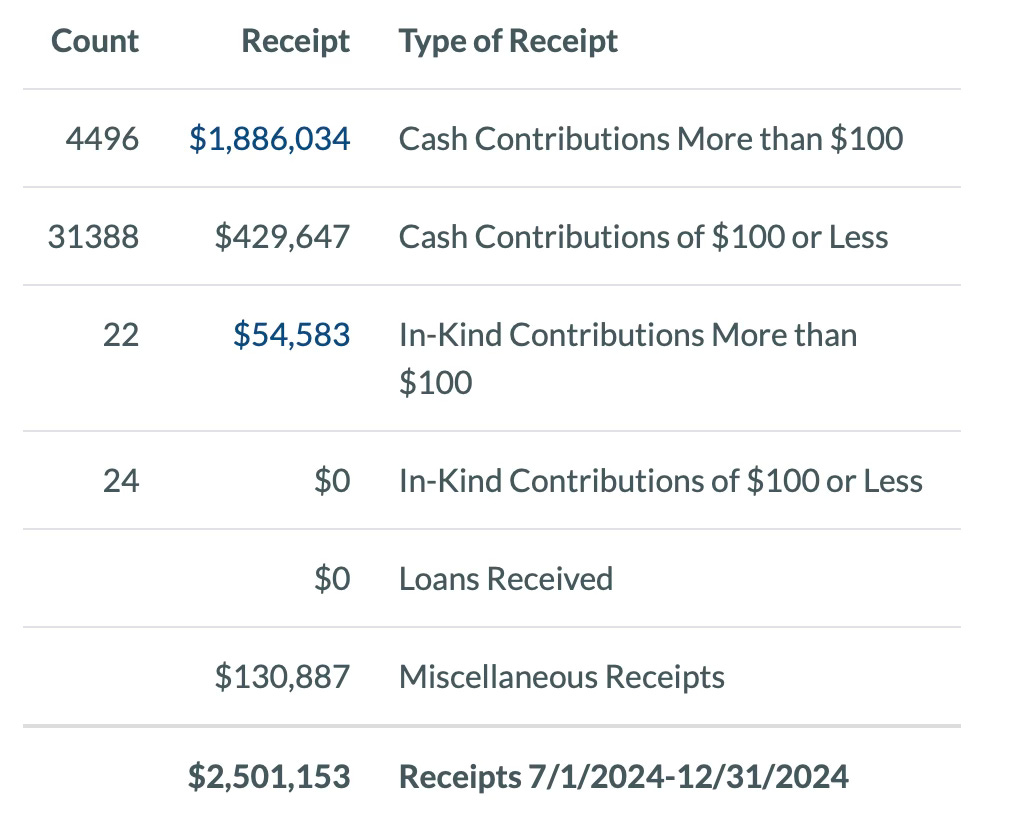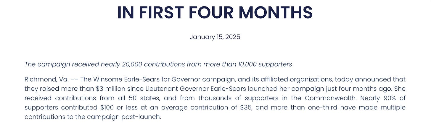 Earle-Sears is prohibited from fundraising until probably the end of February and her $2.1 COH will drop quite a bit since the campaign’s expenses continue. There are also likely deferred vendor payments from the end of 2024 that will need to be paid.