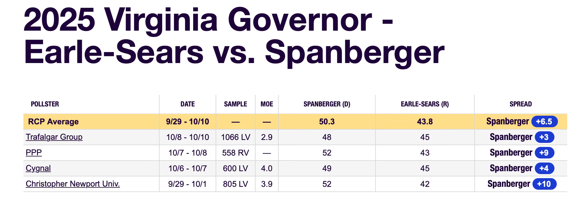 BIG QUESTION - has Virginia shifted from D+3 to D+1? Earle-Sears general consultant Mark Harris recently said as much on the John Fredericks Radio Show.