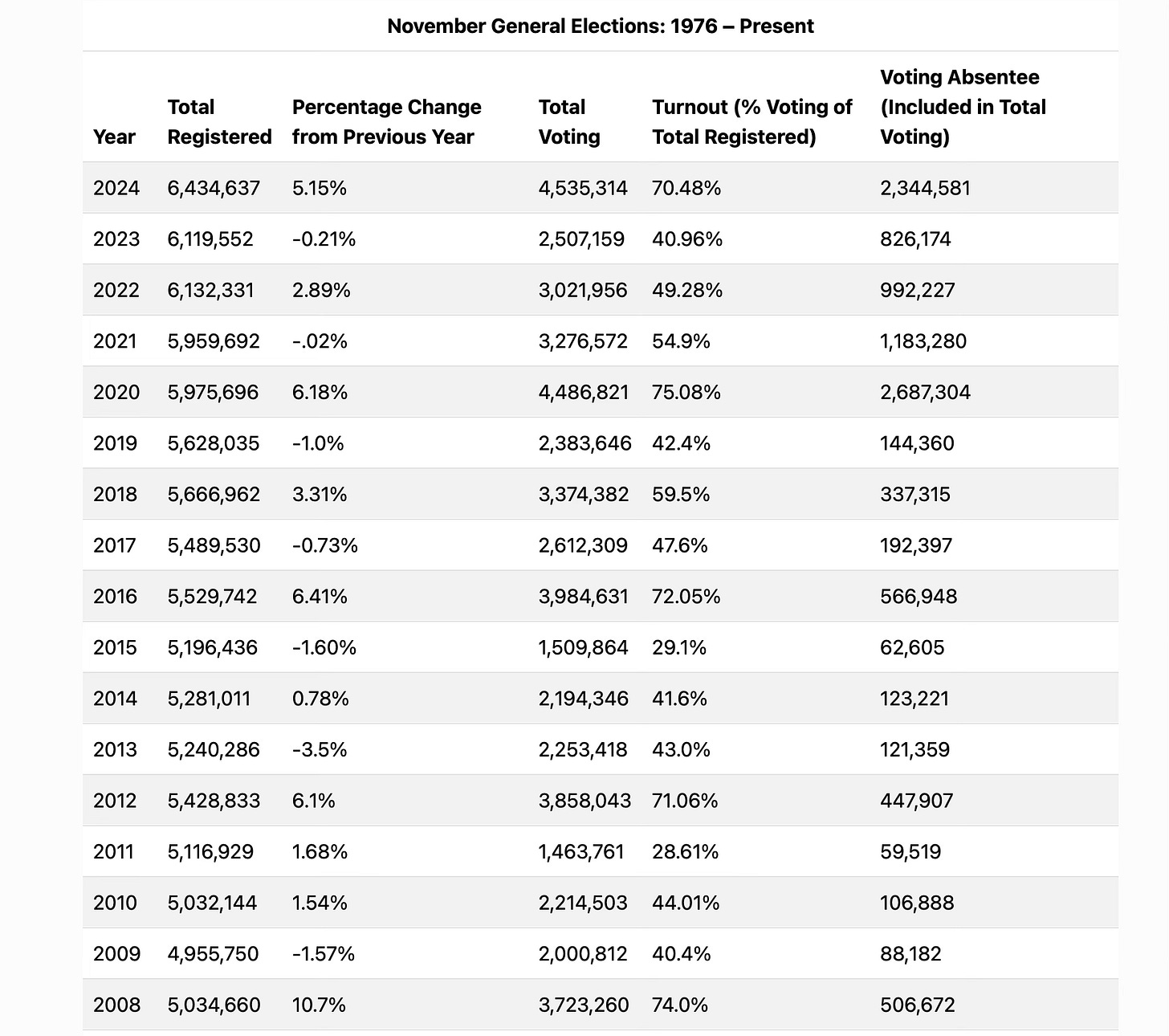 The turnout % - last four gubernatorial cycles has gone 40.4% - 43% - 47.6% and in 2021 almost 55% respectively.