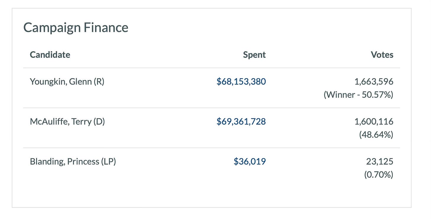 Not only did Republican Glenn Youngkin win with over 50% of the vote, he did it by cranking up GOP turnout but had to spend almost $69MM to do so.